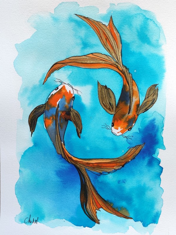 Cette encre, intitulée « Le ballet des carpes Koï », représente deux carpes Koï semblant danser en harmonie dans une composition évoquant le symbole du yin et yang. Les carpes, peintes dans des tons oranges vibrants et contrastées par du bleu outremer, sont délicatement rehaussées d’une touche d’encre dorée pour un effet scintillant. Leurs contours sont soulignés avec un liner noir fin, ajoutant finesse et précision au dessin. Les carpes évoluent dans une eau turquoise.