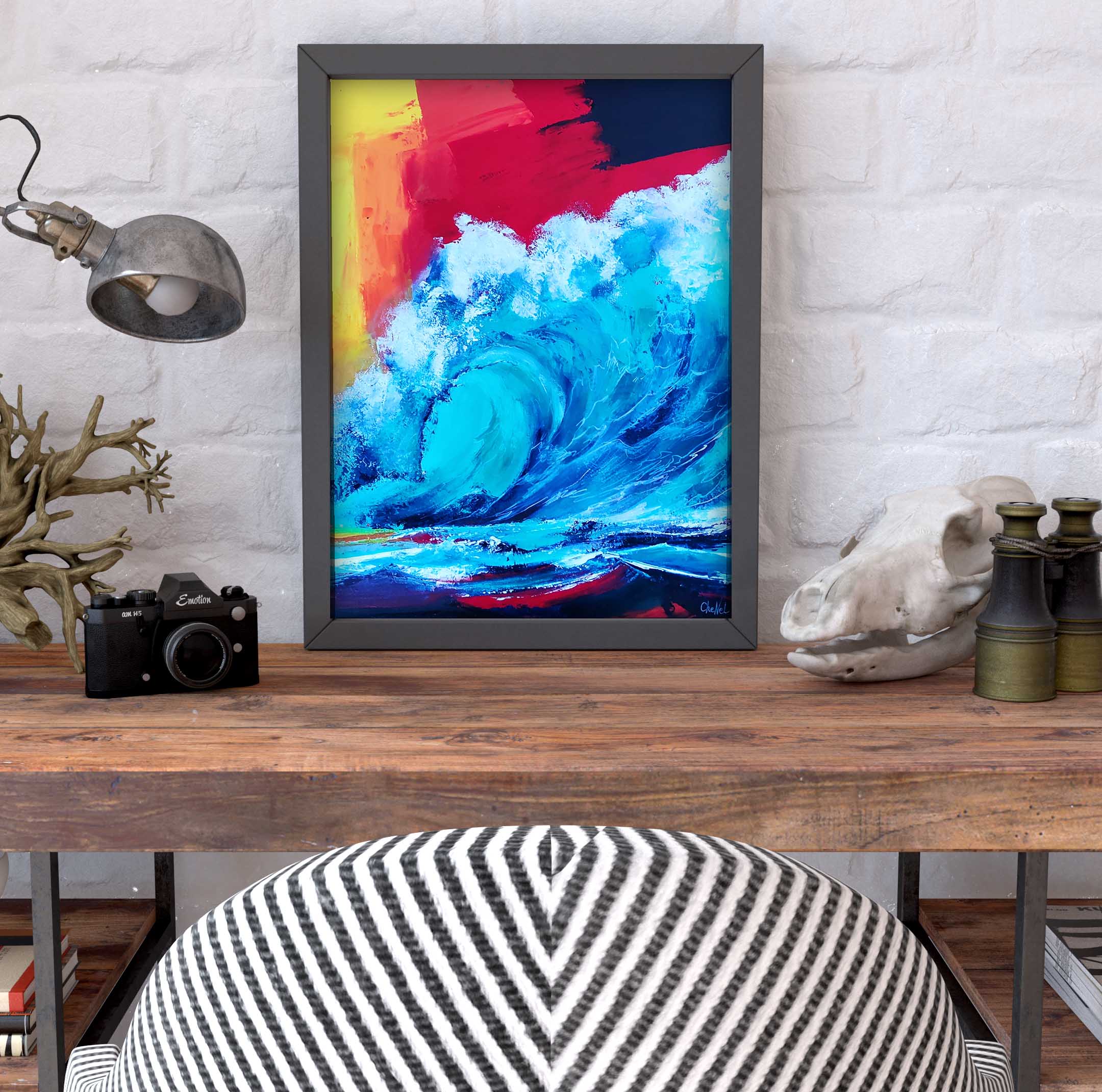Le ciel est travaillé au couteau avec des touches de rouge et de jaune, apportant une intensité vibrante à la scène et contrastant avec la puissance de la vague. Ce tableau incarne la force et la beauté de Teahupo’o, une destination mythique pour les surfeurs du monde entier.
