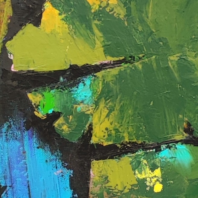 Peinte uniquement au couteau, ce tableau offre des reliefs et une palette de couleurs dominée par les verts, les turquoises, et des ocres, le tout souligné par des contrastes de noir.